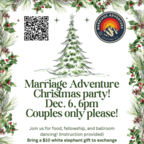 Join us on December 6, 2025 at 6:00 p.m. at our annual Couples Christmas party! There will be food, fellowship, and ballroom dancing! Don't worry: coaches will be provided. Bring one $10 white elephant gift per couple. Can't wait to see you there!!!